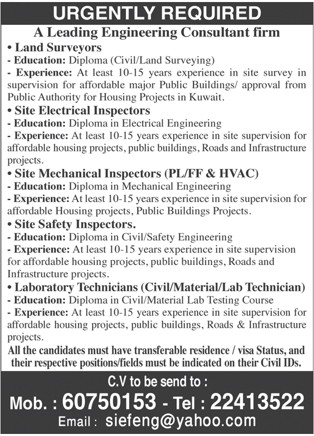 All the candidates must have transferable residence / Visa Status and their respective positions/fields must be indicated on their Civil IDs.
